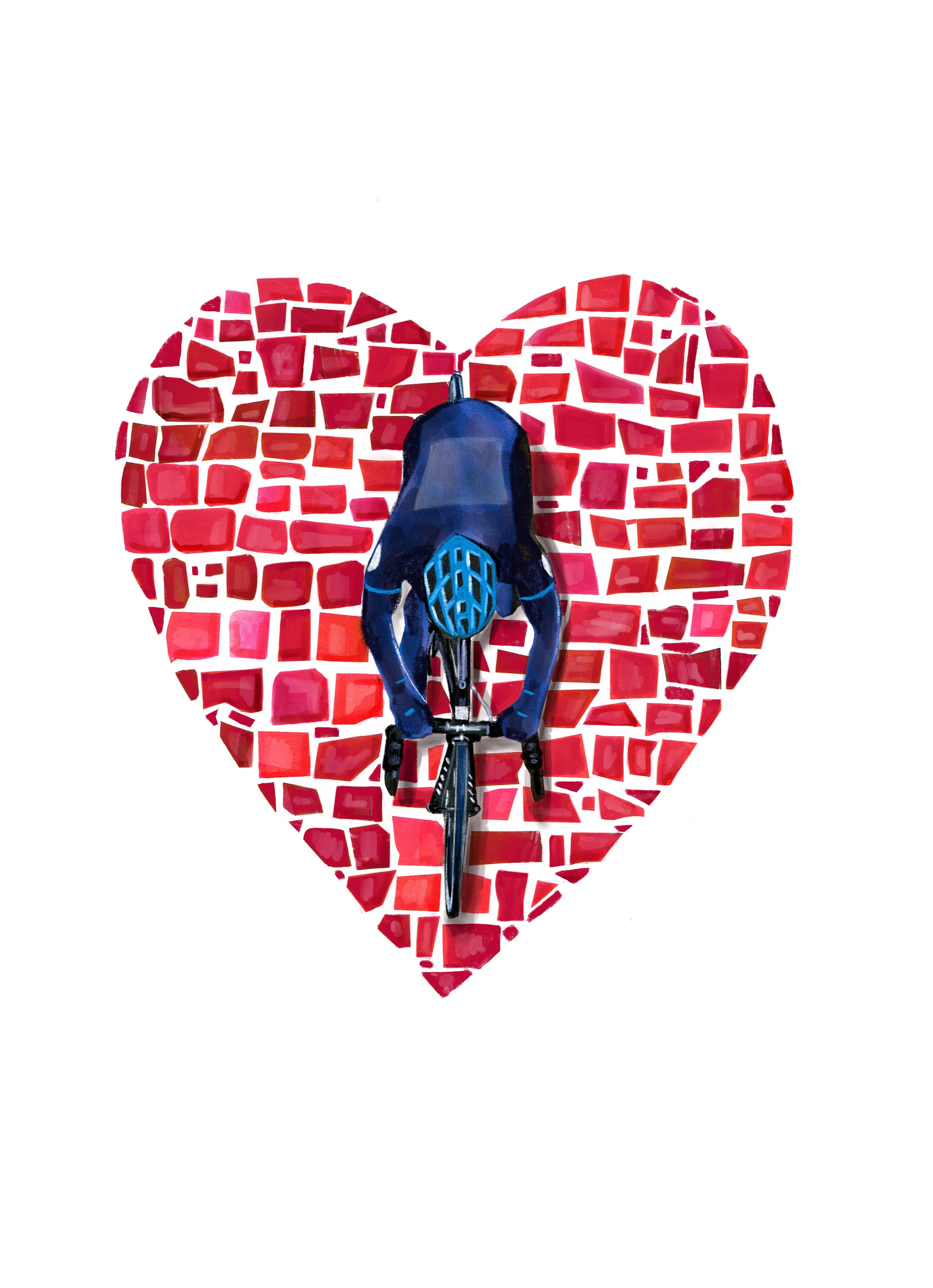 Illustration; cycling; cyclist; heart; peloton; arrhythmia; memory; race; paris-roubaix; heart-problems; abnomalities; red; blue; cobbles; pro; sports; bike